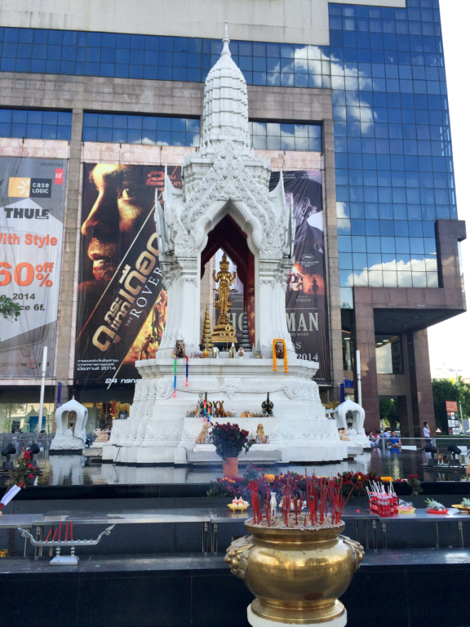 Đền Trimurti Shrine nằm ở khu vực Central World, ngay trước trung tâm thương mại. Tại đây luôn có người cầu nguyện, nghi ngút nhang khói và đầy ắp hoa tươi. Người dân Thái Lan tin rằng, thời gian cầu nguyện thiêng liêng nhất là vào thứ 5 hằng tuần, lúc 9h30 sáng và 21h30 tối. Do đó, đây là lúc ngôi đền tập trung đông người nhất.