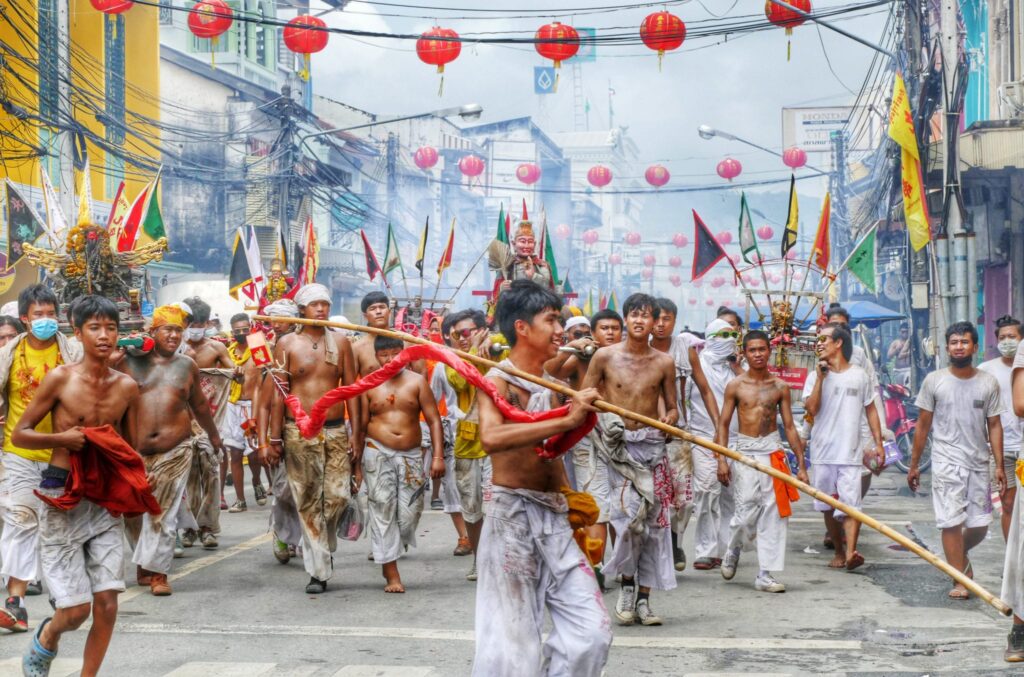 Lễ hội này được tổ chức năng xua đuổi ma quỷ, đe dọa những linh hồn tà ác, thể hiện niềm tin vào sự phù hộ của các vị thần. Người dân Phuket sẽ cùng nhau xuống đường để diễu hành khổ hạnh. Họ nhịn ăn, sử dụng các vật sắc nhọn xuyên qua miệng, mặt và cơ thể. Khung cảnh vô cùng rùng rợn, nhưng cũng là một nét văn hóa độc đáo ở Thái Lan.